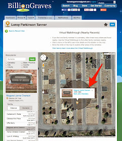 Clicking on any one of the names takes me to that person's burial page and the process can continue. I am really impressed with this technology. This whole process is enabled because BillionGraves.com records the GPS coordinates of the graves at the time the photos are taken.