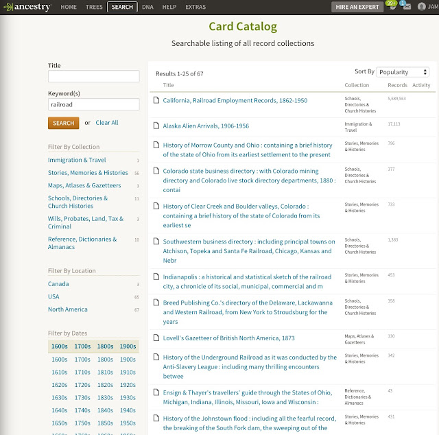 The Ancestry.com Card Catalog has a list of 67 collections of records, mostly from the United States, but mostly contained in the section of Stories, Memories and Histories. Here is a screenshot of the list on Ancestry.com found by searching for the keyword "railroad":