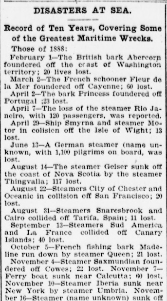 The entire article lists well over 100 major shipwrecks. This is only one example of the challenge. But this is the reason for the Third Rule of Genealogy. We can assume that after 110 years or so, that everyone is dead. There are very few reasons why some official mention of the death is crucial to identifying an individual. Do you know if one of your ancestors was or was not on one of the boats that sank at sea listed above?